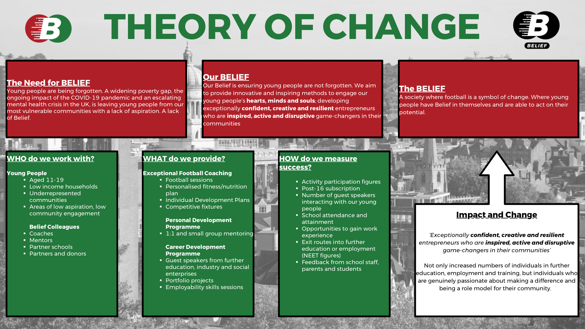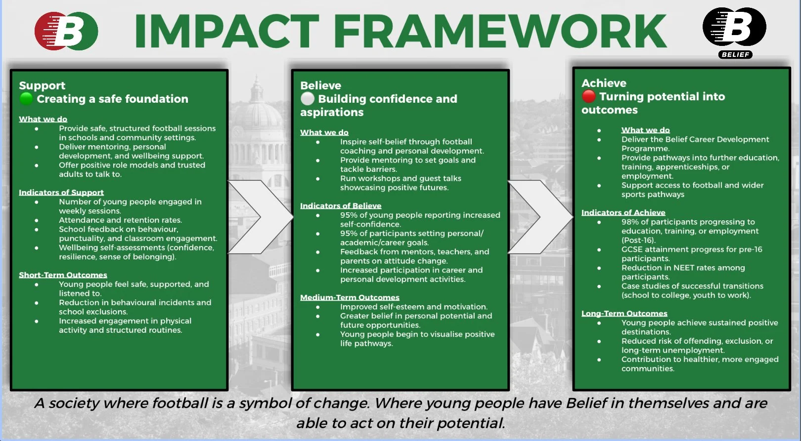 Belief is split into two programmes. The central programme, Belief, works with schools to provide football coaching, mentoring with personal development and career skills development.